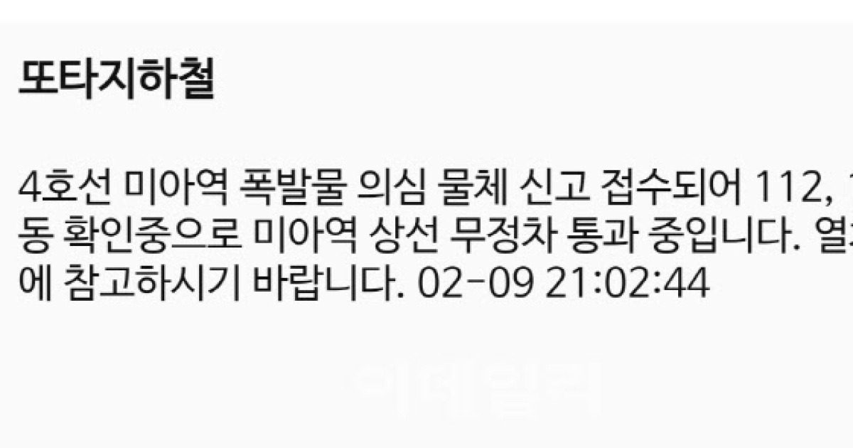 Web 1 day ago가. Web 1 day ago서울뉴스핌 박우진 기자 서울지하철 4호선 미아역에서 폭발물 의심 물체가 있다는 신고가 접수돼 현재 미아역 상행선은 무정차 통과하고 있다. 서울 지하철 4호선 미아역 승강장에 폭발물 의심 물체 신고가 9일 들어왔지만 확인 결과 개인물품인 것으로 판명됐다.